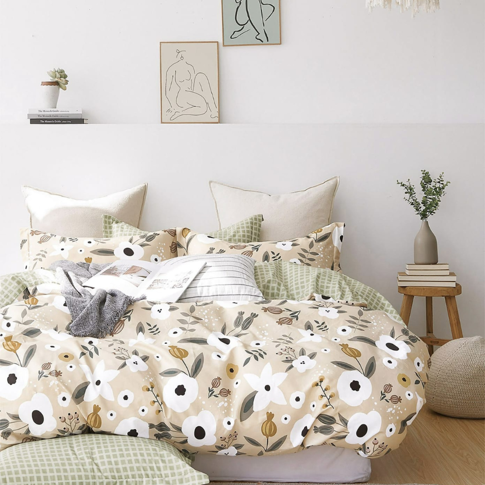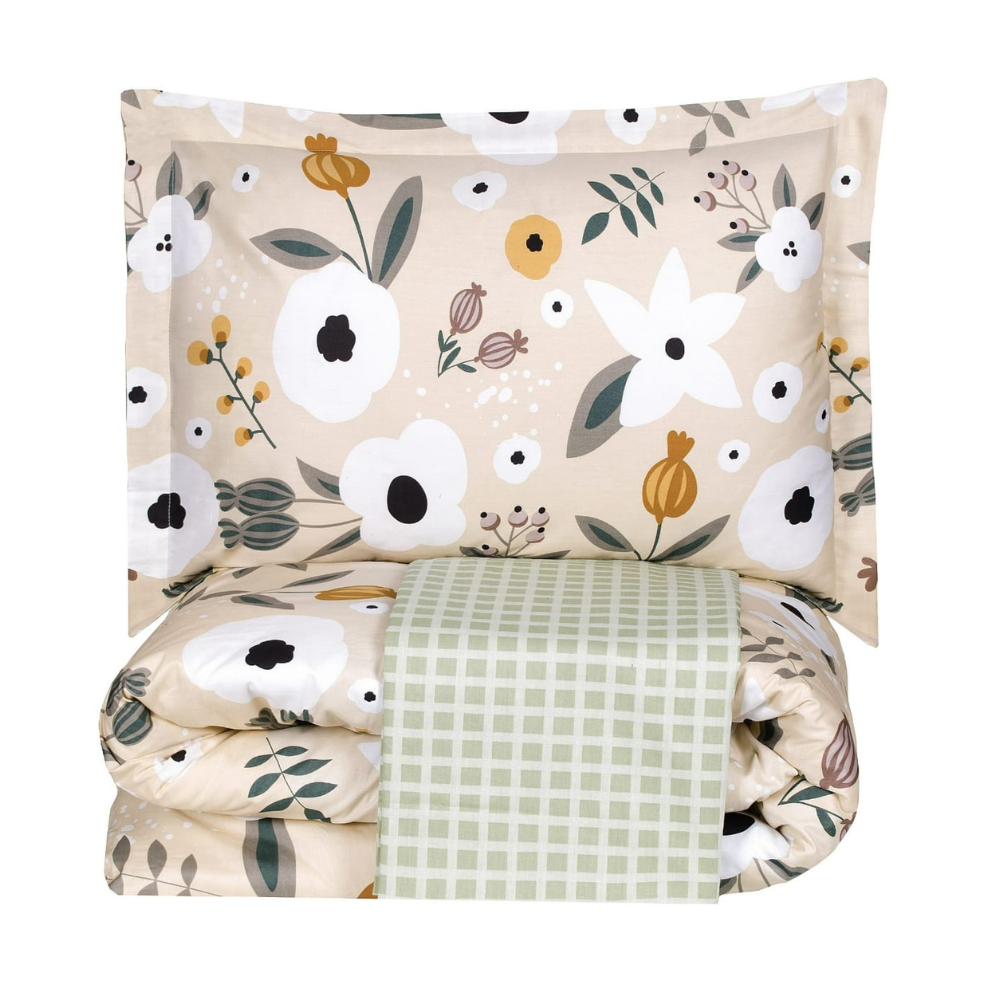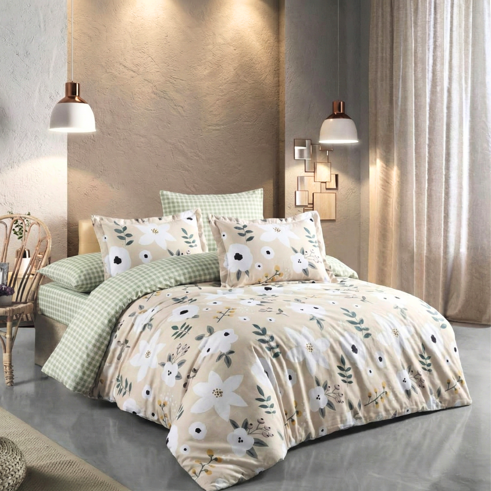 Lenjeria Poppy transformă dormitorul într-un spațiu luminos și elegant, datorită combinației armonioase dintre imprimeul floral cu maci și nuanțele calde de bej și verde salvie. Țesătura de 110 grame pe metrul pătrat, din bumbac satinat, oferă o senzație plăcută la atingere, fiind moale, netedă și răcoroasă. Este alegerea perfectă pentru cei care iubesc naturalețea și rafinamentul subtil.