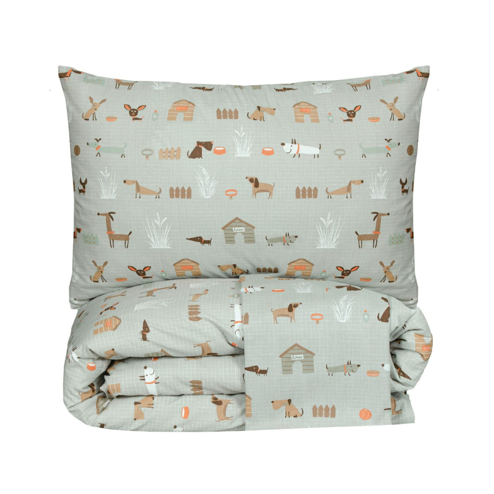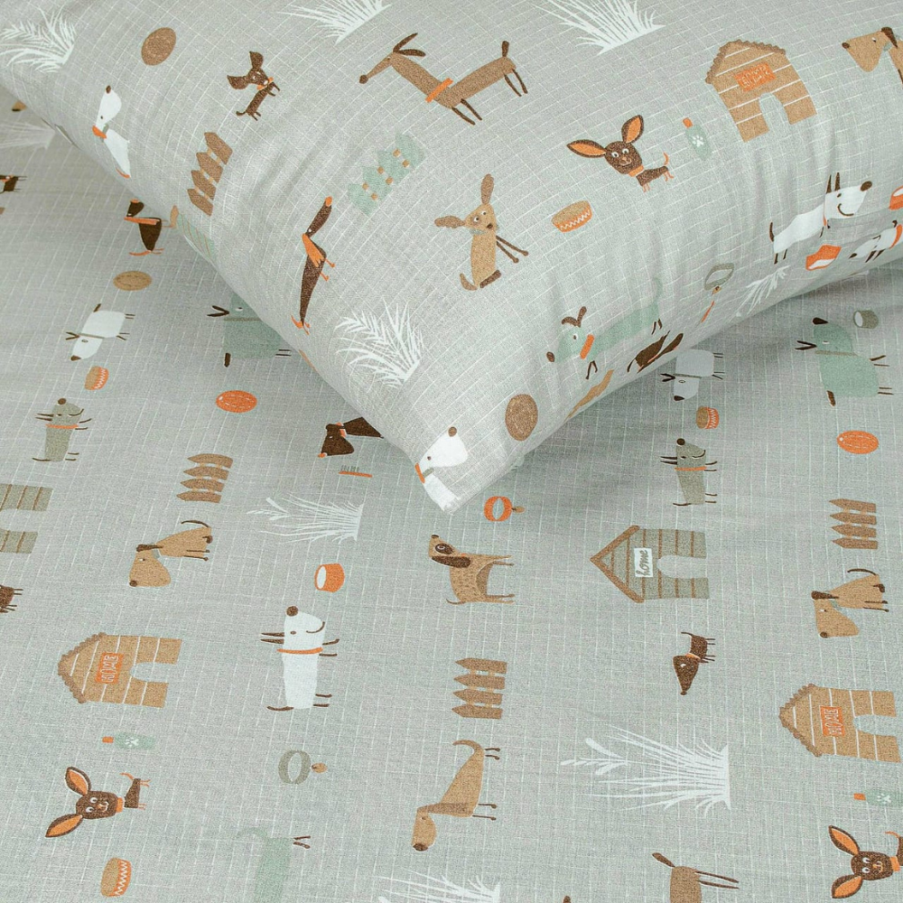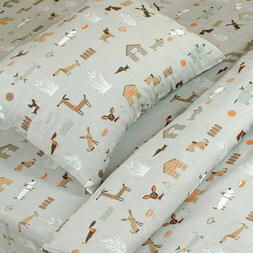 Setul „Haw Haw” aduce o notă veselă și prietenoasă în dormitor, fiind alegerea perfectă pentru copii sau iubitorii de animale. Cu imprimeuri jucăușe de cățeluși în nuanțe calde de bej și maro, lenjeria creează o atmosferă relaxantă și plină de voie bună. Țesătura din bumbac 100% de 120 grame pe metrul pătrat este moale, respirabilă și ideală pentru un somn odihnitor.